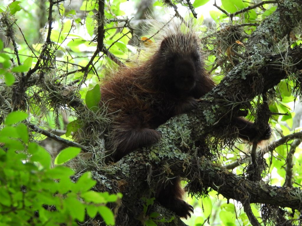 Now, back to today. “My” porcupine today was resting in the same oak tree on and off for a few weeks, displacing a roosting Barred Owl who previously claimed the tree for his own. It seems to find the live oak a good place for a nap, stretching out across its heavy branches some 15 feet or so up in the canopy.